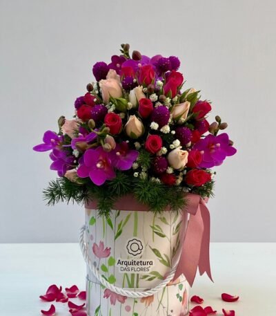 Elegante box exclusiva da Arquitetura das Flores com Cravos coloridos, o presente ideal para comemorar conquistas com pessoas que amamos. Comemore com flores!