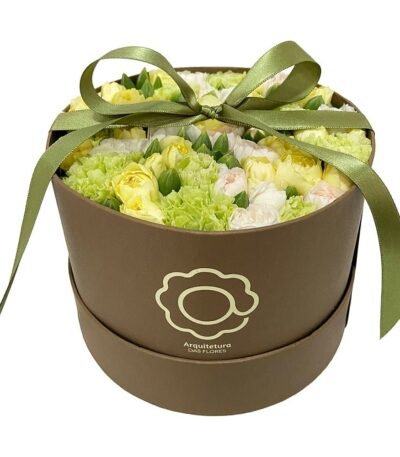 Delicado e com cores leves, o arranjo em box Lemon destaca beleza do Mix de Flores em tons de verde