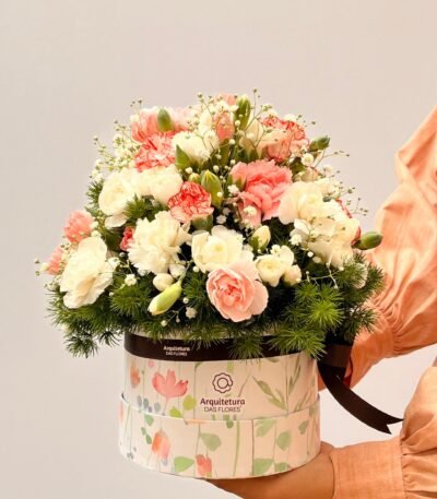 Box de Cravinas flores em tons rosa e branco. Transmita amor e carinho por meio da beleza da natureza, criando um momento memorável e encantador.