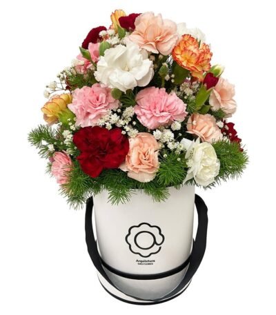 Elegante box exclusiva da Arquitetura das Flores com Cravos coloridos, o presente ideal para comemorar conquistas com pessoas que amamos. Comemore com flores!
