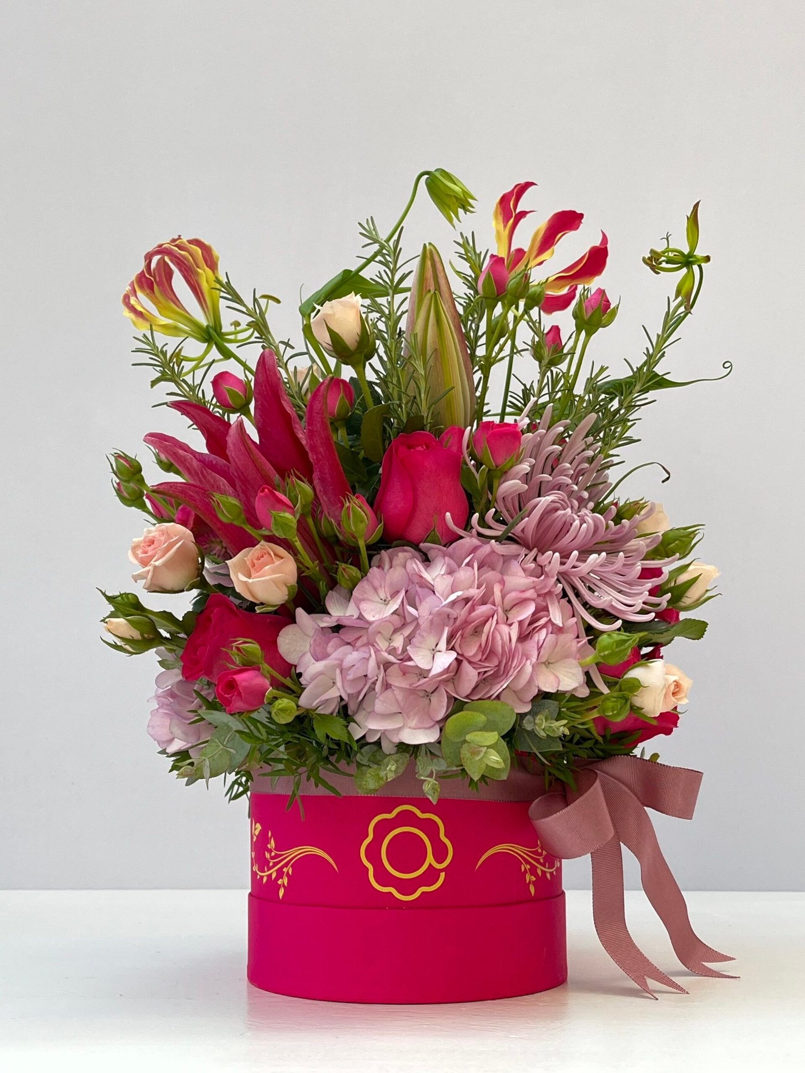 Celebre a feminilidade e a delicadeza com o nosso encantador Box Flower Pink – uma coleção exuberante de flores cor-de-rosa e pink, que inclui rosas, mini rosas, hortênsias, alecrins e folhas de eucaliptos cheirosos.
