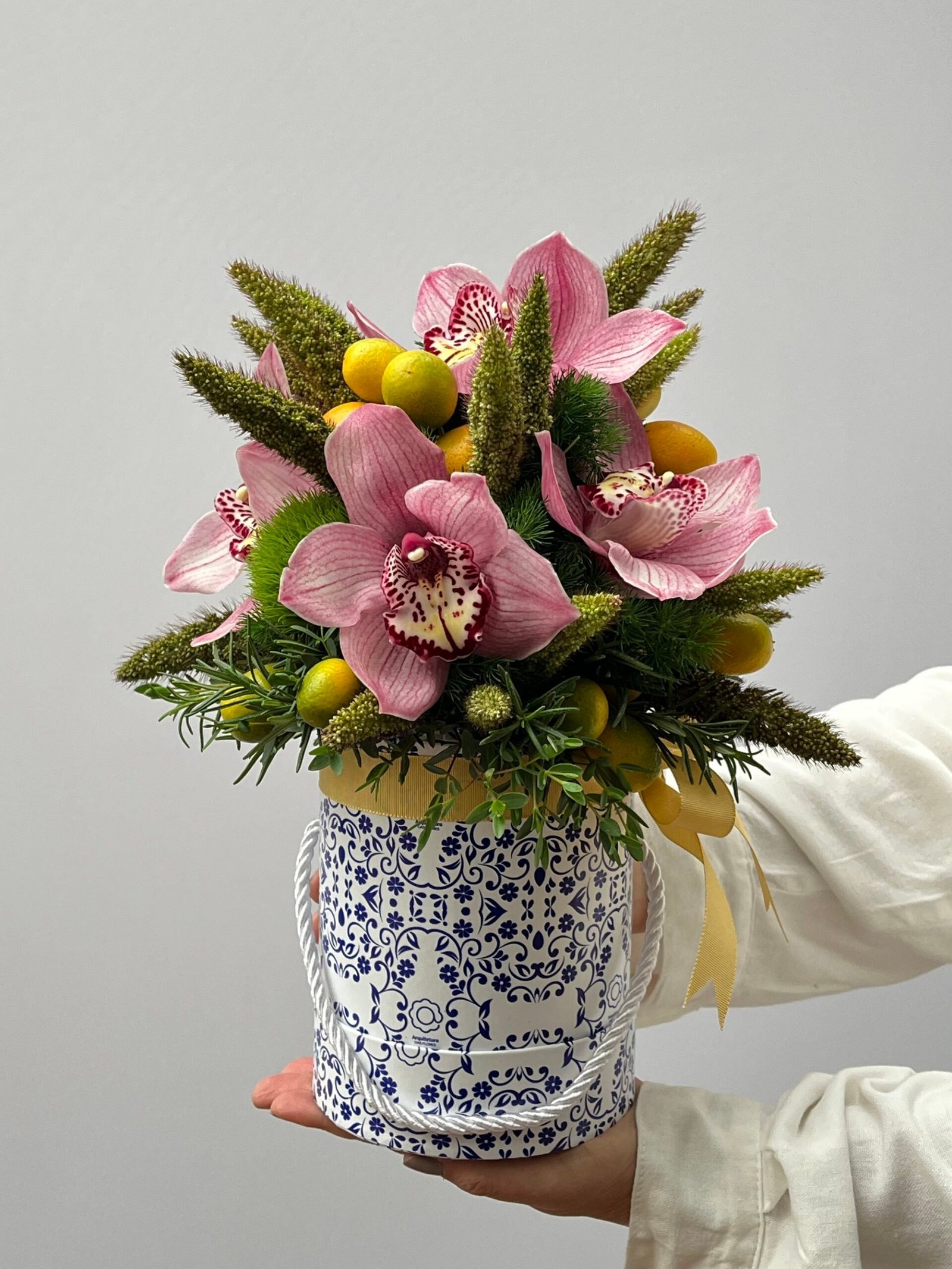Belíssimo arranjo de Orquideas cymbidium em box exclusiva, com trigo aiwa e detalhes de craspedia. Uma verdadeira obra de arte para presentear e decorar com muito carinho.