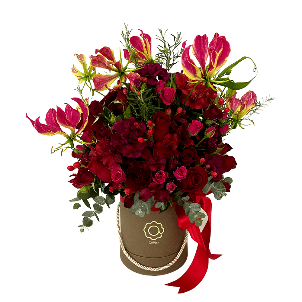 Em tons de vermelho, pink e bordô, o arranjo “Murasaki” ressalta a delicadeza do Mix de Flores Nobres.