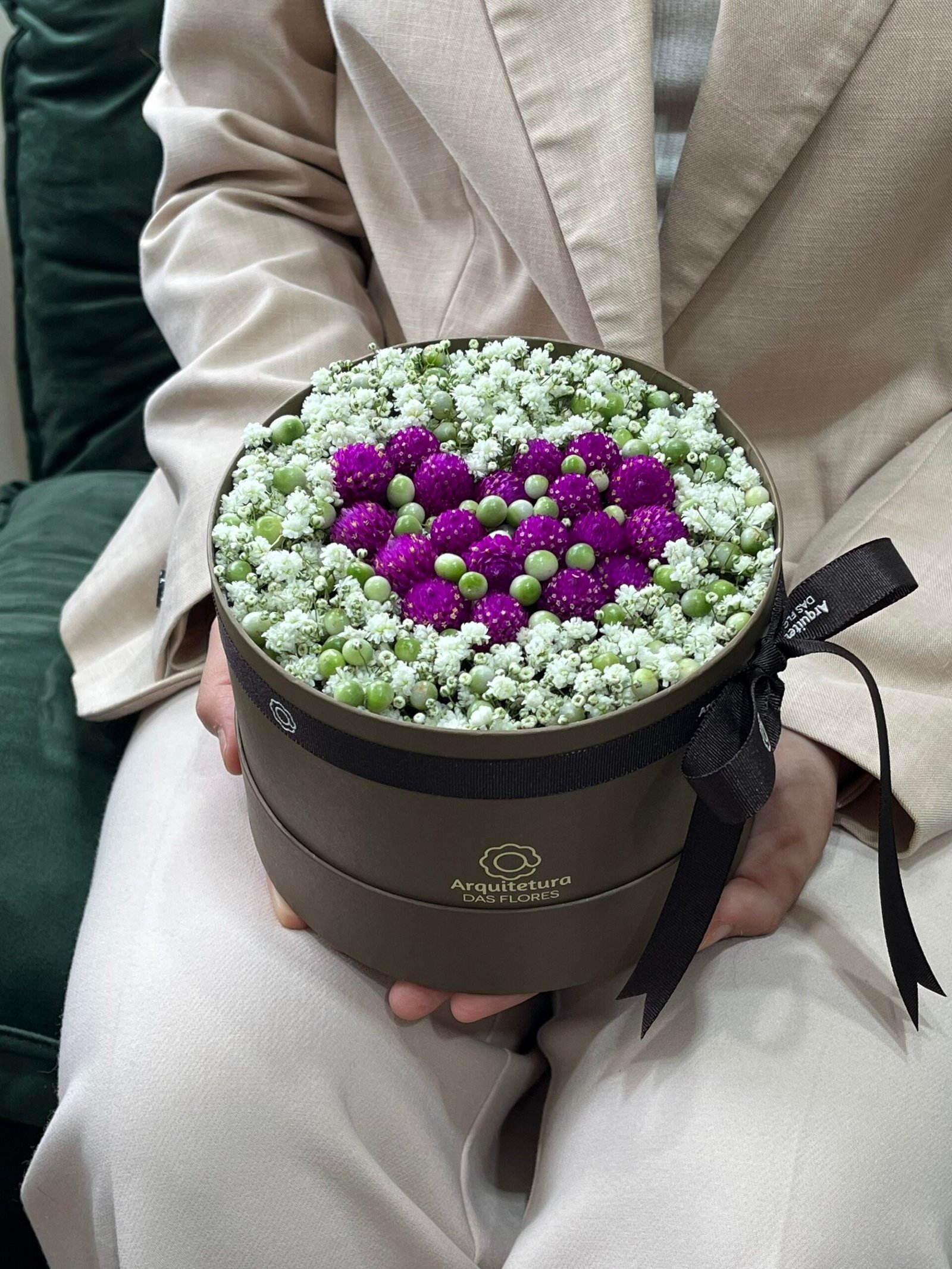 Ao centro, flores de Perpétua em forma de  coração — envolvido por verdes suaves e brancos sutis. Uma pequena arquitetura de sentimentos.