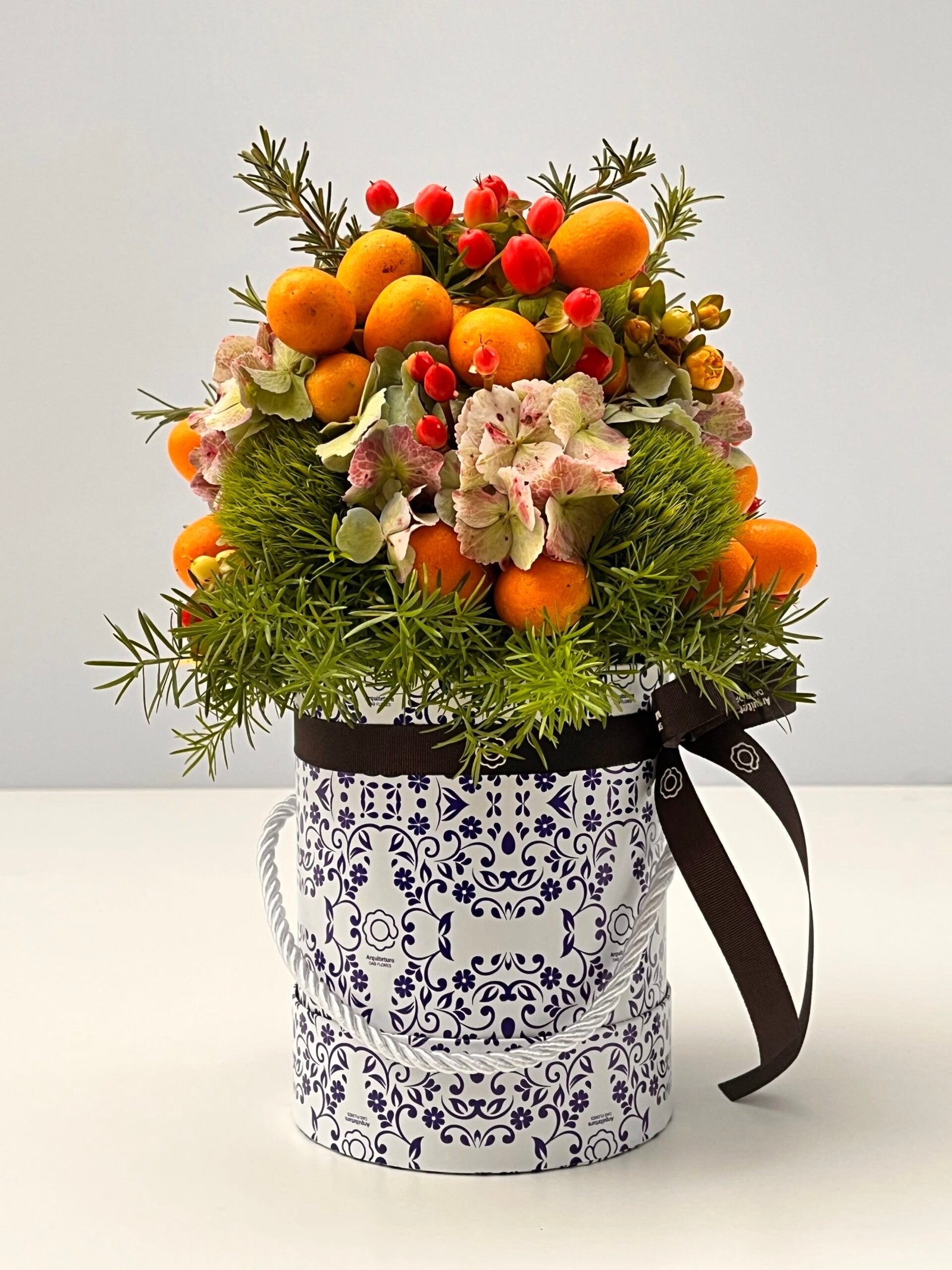 Ornato é uma peça que celebra o encontro entre natureza e estética. Uma composição rica em texturas e contrastes: Laranjinhas dourados, Hypericums, hortênsias e folhagens aromáticas criam uma cena viva e expressiva, disposta com precisão em uma box inspirada em ornamentos clássicos. Um presente que é, ao mesmo tempo, arte e gesto.