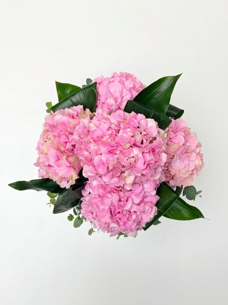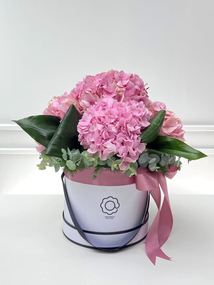 Surpreenda alguém especial com a Box de Hortênsias cor-de-rosa e folhas de Eucaliptos cheirosos, uma fusão perfeita de cores suaves e aromas revigorantes.