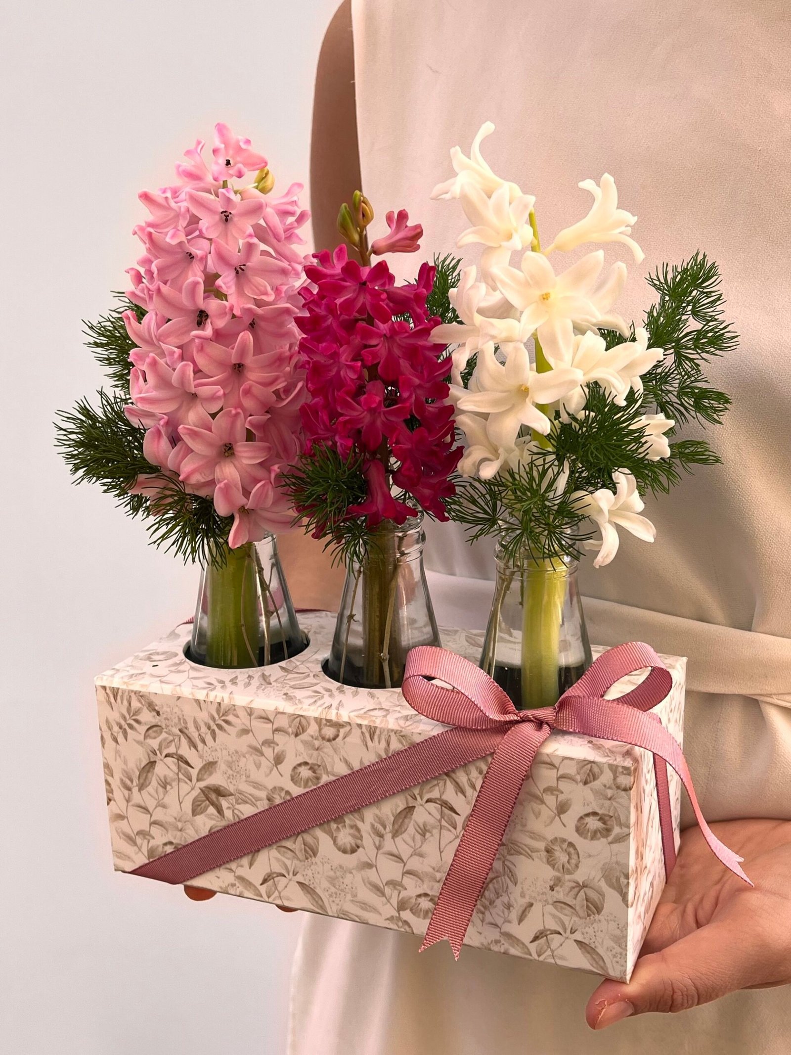 Três hastes de Hyacinthus natural, em tons de rosa, vinho e branco, dispostas com elegância dentro de uma caixa delicada, envolvida por um laço de cetim.