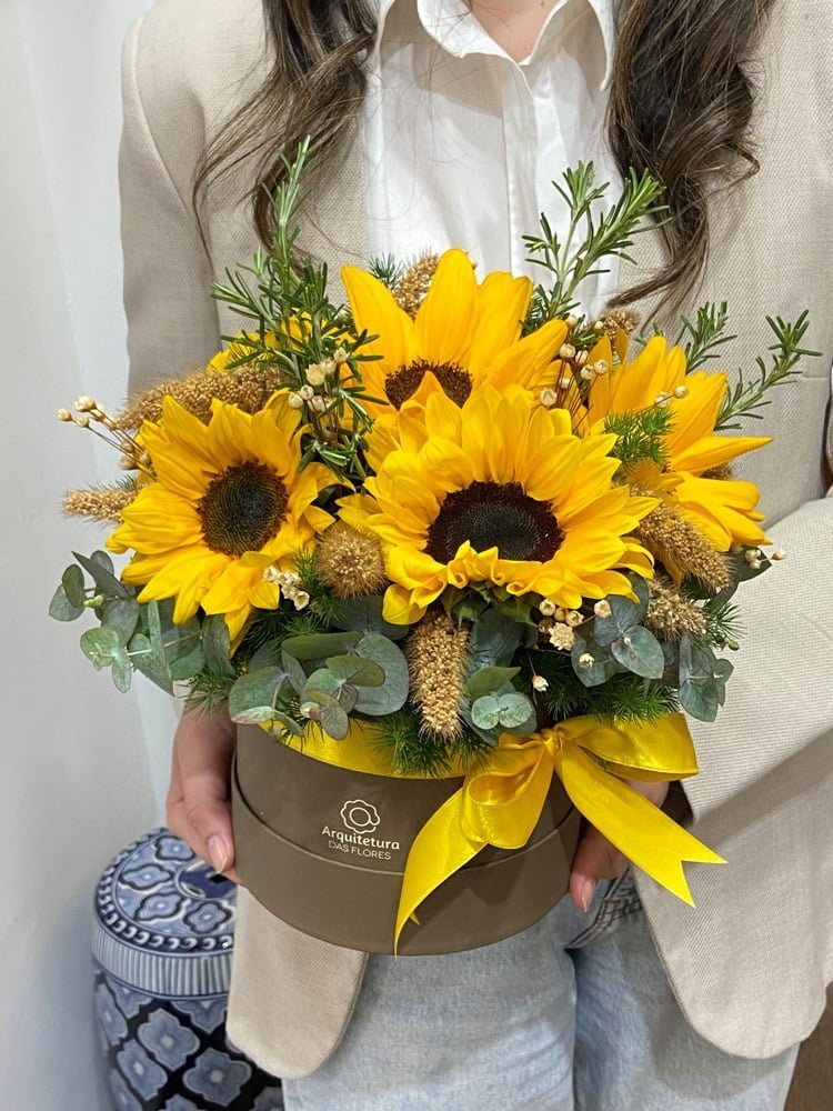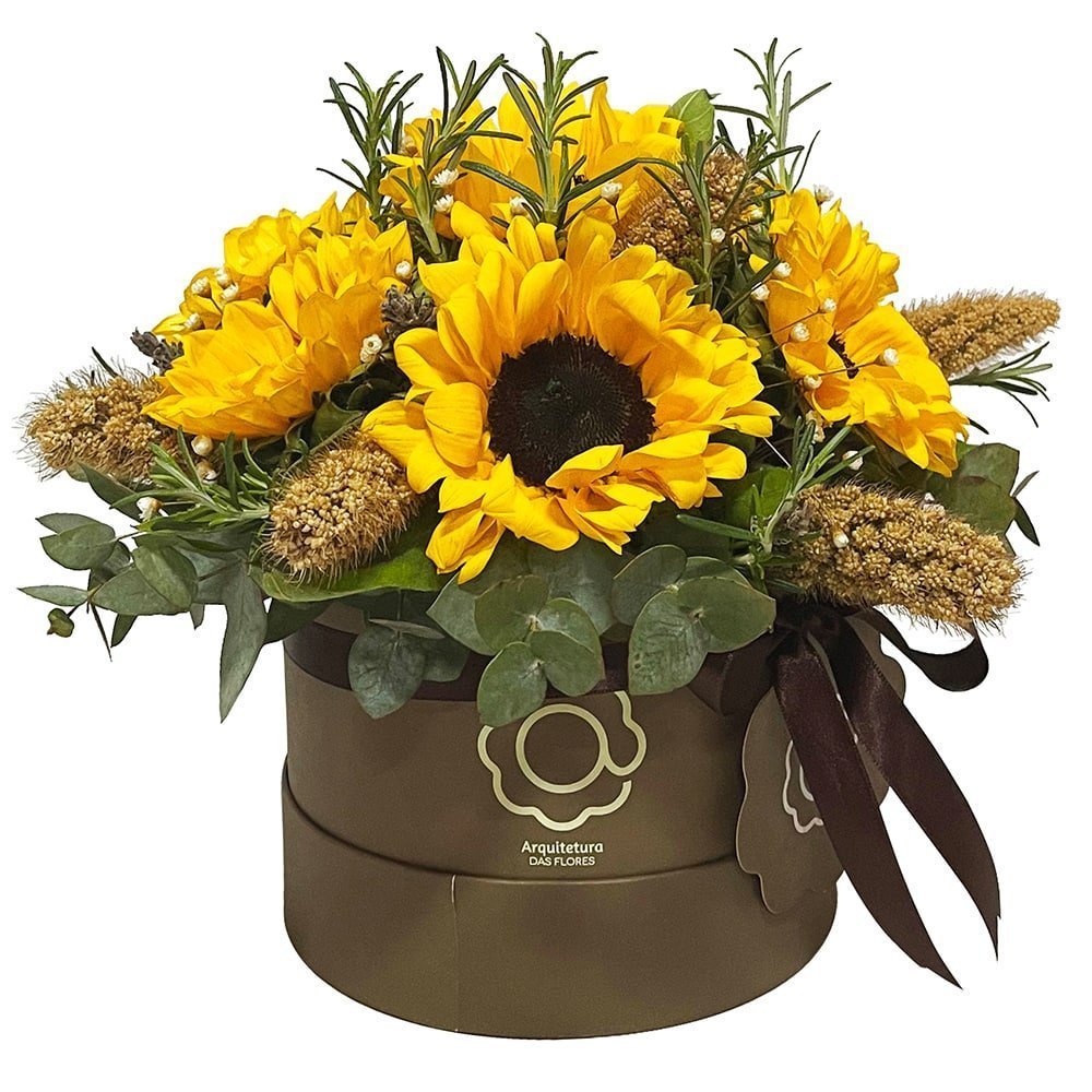 Alegre e simpática box de 06 Girassois com detalhes de Alecrim e Eucaliptos. Sunshine é um lindo presente para momentos especiais!